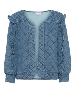 Kjempe fin quilted jakke i denim med feminine rysjer på ermene. Den har ikke knapper i front og har en liten v-utrigning. Denne kan brukes til alt.