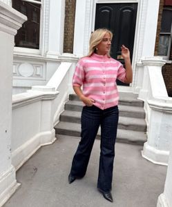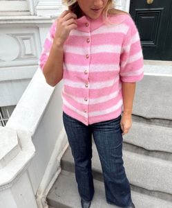 Fin og god cardigan i rosa striper. Den har korte ermer og fine gullknapper foran. Lekker til fest, men også fin til hverdags.